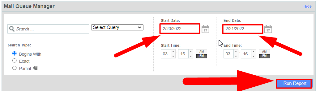Once you input a search for one of these options, select the corresponding option from the Select Query drop down menu next to the text box: Search Sender, Search Recipient, or Search Message ID.