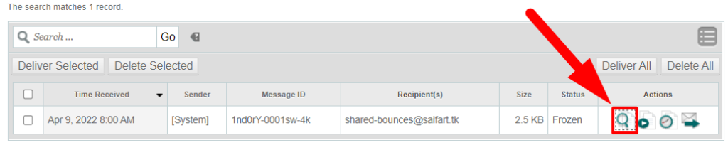 To view an email currently in the queue, under the Actions column, click the magnifying glass icon: